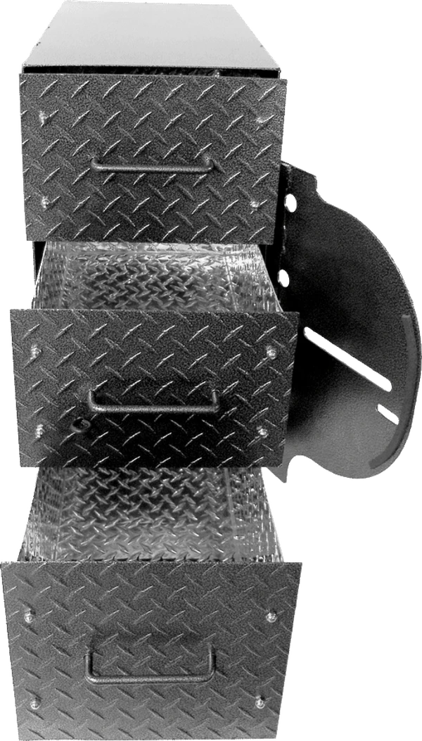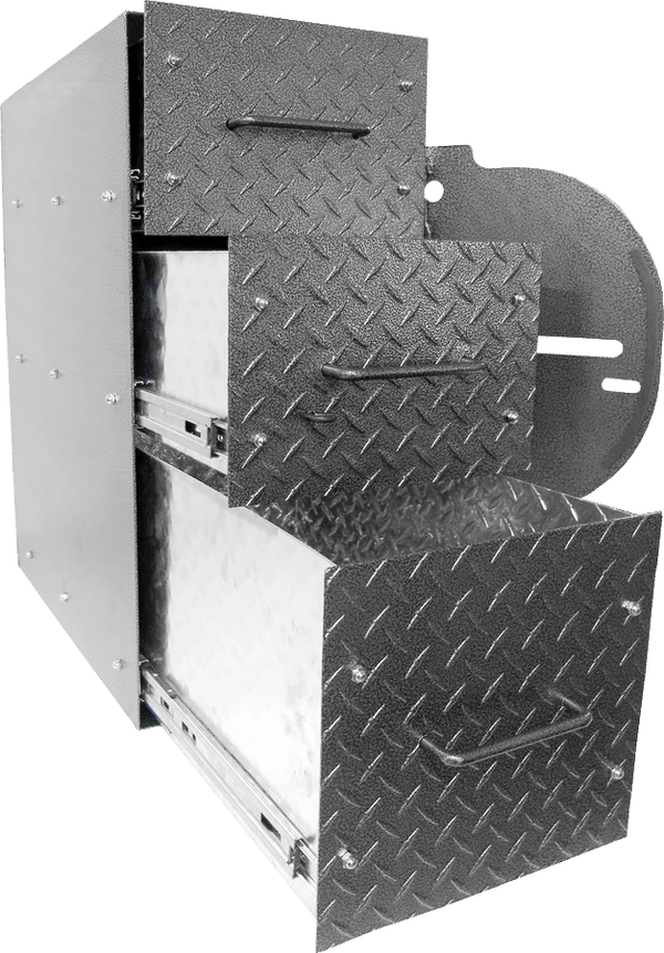 Our 3 Drawer Locking Storage Cabinet is a great place to store your gear inside your vehicle or out. The upper 2 drawers are 8″ deep while the bottom drawer is 12″ to store larger items. All 3 drawers have a chrome interior so you can more easily see what is inside during low-light situations. The outside is completed with a beautiful black/silver vein durable powder coat finish that matches our K9 Plus Transport inserts and all our powder coated crates.