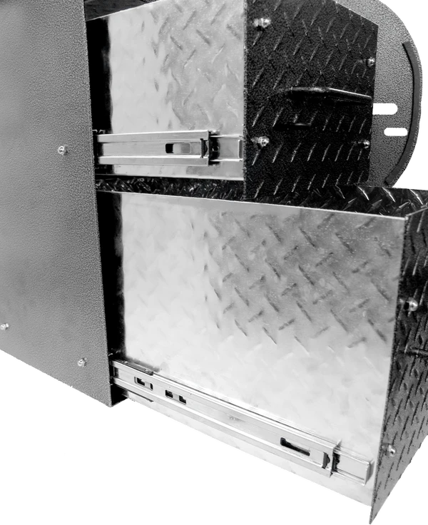 Each drawer is mounted on 2 heavy duty ball-bearing slides that move very smoothly and will not bind. All 3 drawers have a catch so they will stay shut, even if vehicle is parked on a hill or during hard acceleration.