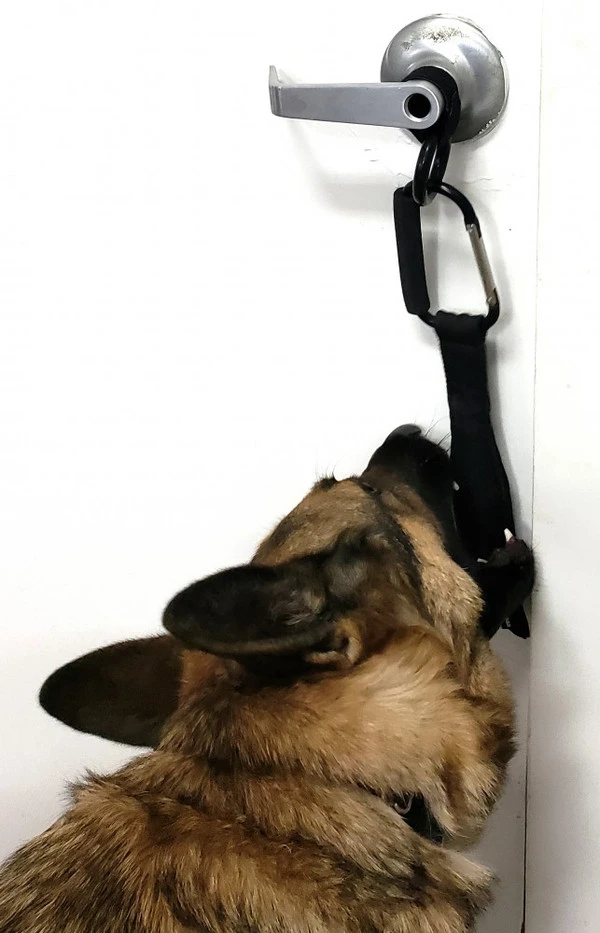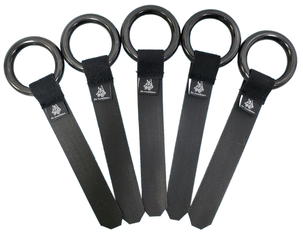 These plastic rings attach to an object with their one-wrap Velcro tape. The one-wrap Velcro is stitched securely to the ring. These rings can be used with the Open Task Carabiner or by themselves. The rings work well on items such as a lever door handle. This ring will help the carabiner from slipping off the lever door handle which is an open end style door handle. It can be used on many items as an additional aid to the Open Task Training Carabiner. Having a set of 5 rings will be convenient as you can leave the rings attached and in place where the dog frequently opens doors or drawers. It will make opening quicker as you don’t need to loop the Velcro around the item first, just snap the carabiner on the ring when needed.