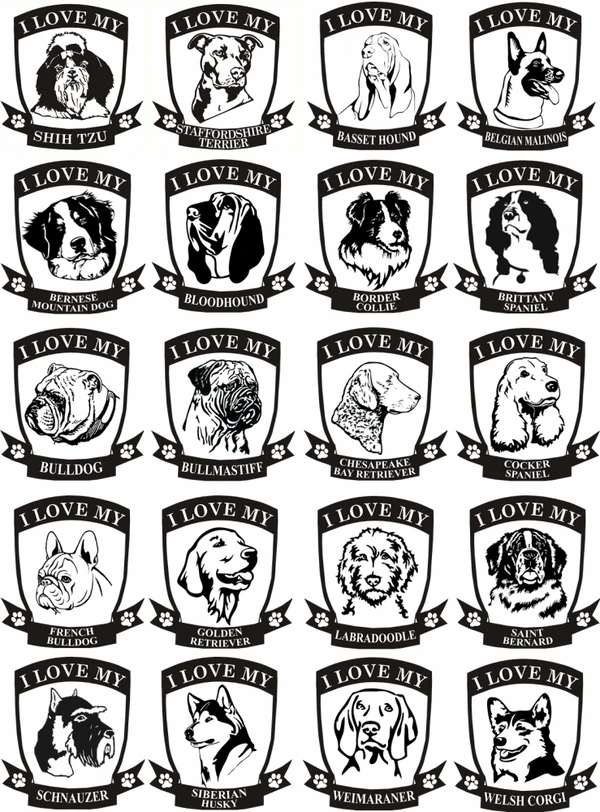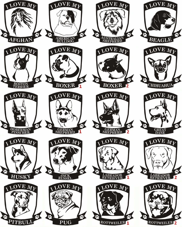 These are the new design for the Dog Breed Specific Decals, and are offered in 40 different dog breeds and 4 colors.