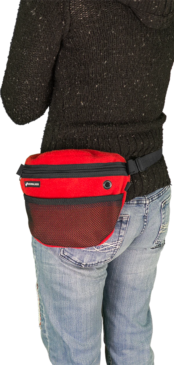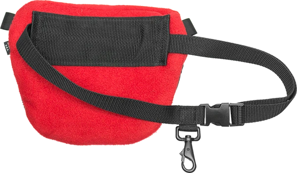 The handler bag outer layer is made from fleece and comes in all the EEZWALKER color choices. The bag opens and closes securely with a zipper closing. The bag interior is lined in water resistant lining and that makes for easy clean out with a damp towel. On the front of the bag there is a grommet opening so you can have your poo clean up bags ready to grab without having to unzip the bag. The bag is contoured to fit around the handler’s waist and is deep enough to hold training treats and other items, such as wallet, keys, sunglasses, poop bags, etc. There is a front lower net pocket for quick access items such as a phone, ID, or pepper spray that many joggers often carry.