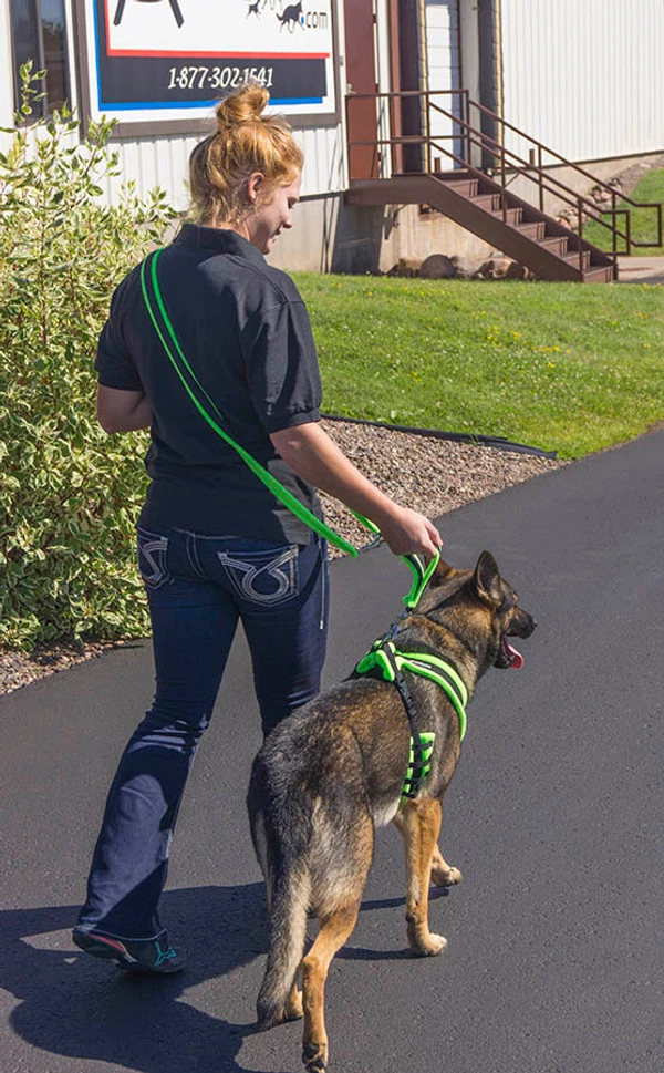 The purpose of the EEWALKER Hands Free Leash is to keep your dog in position while walking or working with you. The EEZWALKER leash is very functional and should be a tool for training every dog. With your dog by your side it learns to adapt to your body movements and your stride. It doesn’t have the option to run here or there. It learns to do what you want it to and can even anticipate what direction you are going to move and move with you.