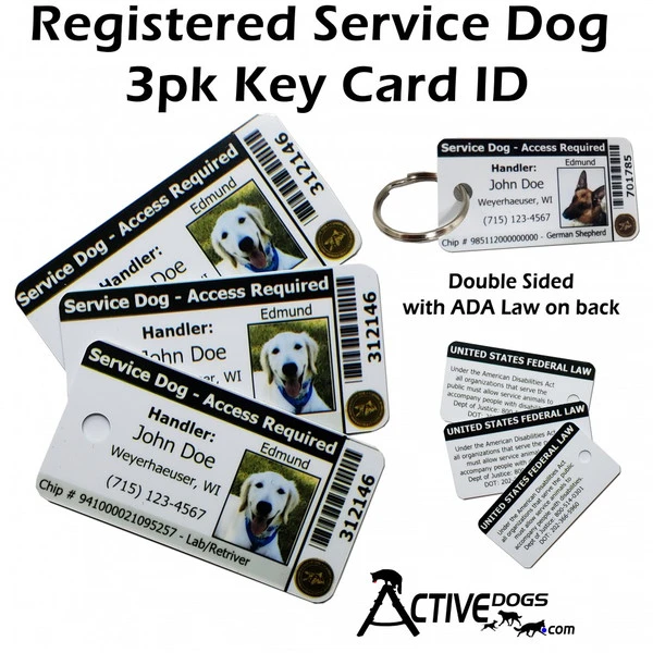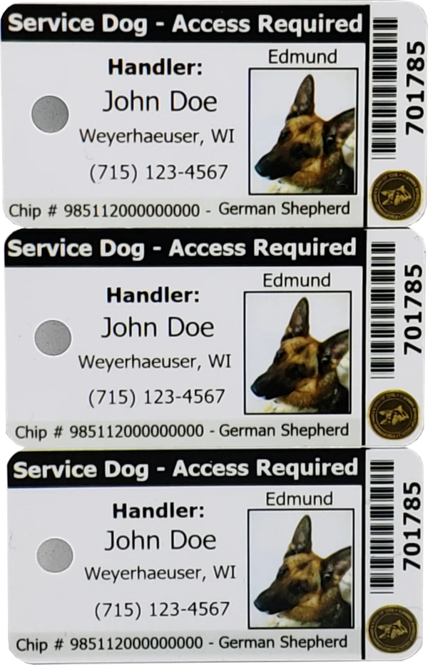 Service Dog IDs will have the ADA (American with Disabilities Act) information on the back of the ID. This information addresses your rights and protects your full access required by law to public buildings.