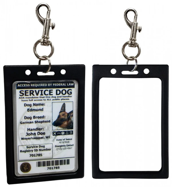 Service Dog IDs will have the ADA (American with Disabilities Act) information on the back of the ID. This information addresses your rights and protects your full access required by law to public buildings.