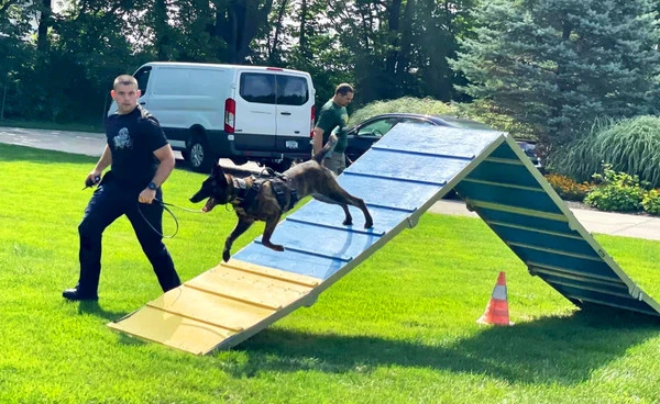 The A-frame can be lowered to any desired height for training a new dog. For extra security, we have incorporated our strap & stake tie down system into the wall (sold separaately) so each corner of the frame can be staked into the ground. No tools are required for set up. Just open up the two halves and place the lock pins in position. Comes with tent stakes for securing the Agility A-Frame to the ground.