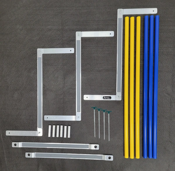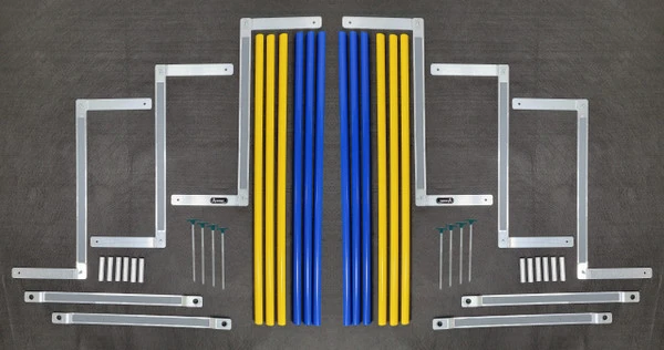 You get the best of all worlds for weave poles with this system. These Weave poles and base meet competition requirements. The added bonus is the base for this breaks down so you can use it for 2×2 training. 2×2 training is a great way to get a dog started in working through the weave poles. This is done by altering the angle and aligning the bases and poles in different positions, gradually positioning the bases with poles into a straight line. Basic training directions come with this product.