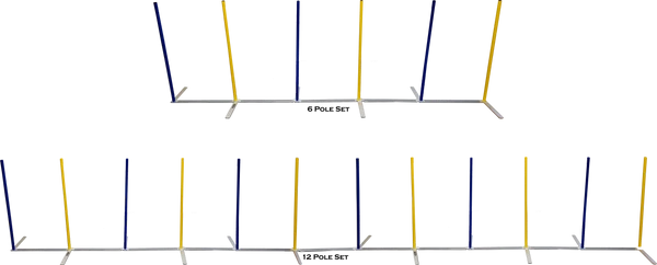 The weave poles are 40” tall, tapeless and come in two colors, blue and yellow. The 6 pole set comes with 3 blue and 3 yellow poles, for a total of 6 poles. The 12 pole set comes with 6 blue and 6 yellow poles, for a total of 12 poles. The poles are made from the highest-grade colored PVC. It is the most attractive, durable and long-lasting furniture PVC on the market. This Furniture Grade PVC is ultraviolet (UV) and corrosion resistant and infused with modifiers so they will not deteriorate and bend in the outdoor sun light. Made in the USA.