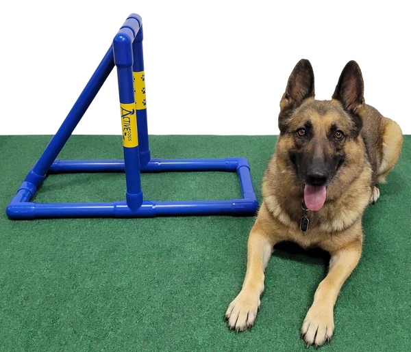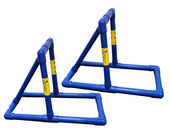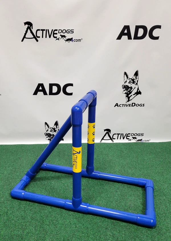 These side ramps are designed with a wider box shape base for steadiness. They are stand alone with cross beam construction which give them strength and solidity. They come with mounting brackets or they can simply be slide tight into position under the side ramp of the agility walk. These tiny work horses are an added advantage to help alleviate bounce in the side ramps. The color is blue with yellow paw print wrap.