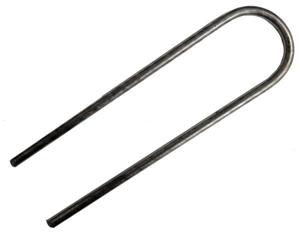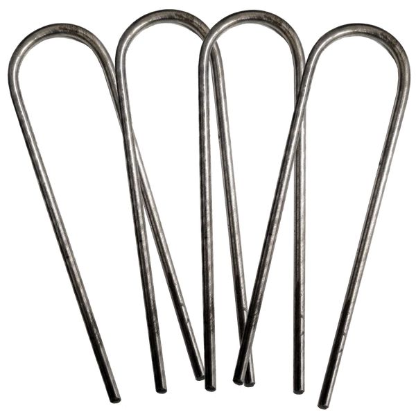 These are no wimpy thin stakes. Made from thick ¼” cold rolled steel with a clear coating on them. They area a full U-loop style stake and measure 8” long. They will fit a pipe or bar up to 1.5” wide. The stake ends are mitered so they are easy to get started into the ground.