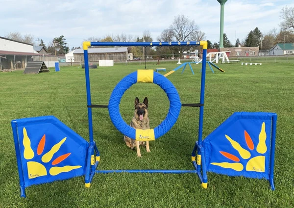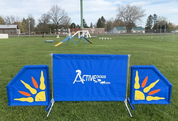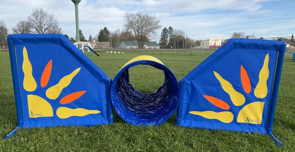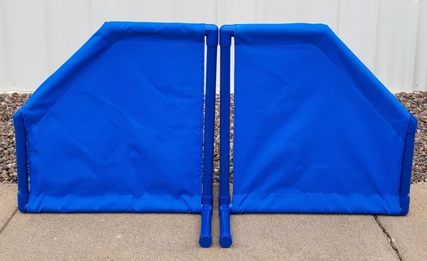 The Free-Standing Starburst Wing frame poles are 1.25” O.D. The UV outdoor fabric panels have a large bright yellow & orange starburst design in the center of the blue fabric. The backs are a solid blue color so you can use the wings either direction. These are great wings that can be used on a variety of jumps and obstacles. They are stable, sturdy, and are significant in size. They can be clearly seen by dog and handler. Because of the design they are very easy to use and can be placed in a range of ways and positions. They will not be in the way of the jump base feet and can be set close to the openings of many obstacles.