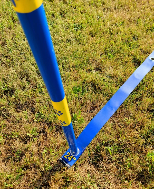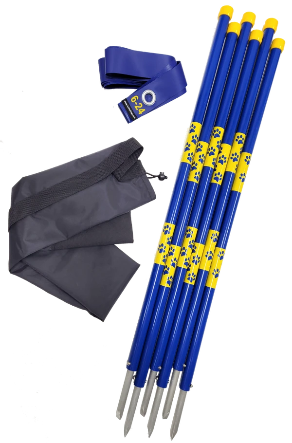 The sets comes in a convenient reinforced bottom carry bag w/shoulder strap and a vinyl pole position guide. The pole position guide has the grommets spaced 24” apart and is made from blue pvc outdoor vinyl material. The pole guide is a very nice feature so you do not have to bring a tape measure to the training field to set up the poles. Just place the posts into the grommet holes, pound them in, and they will be positioned evenly apart. (Never use a metal hammer on any pvc product).