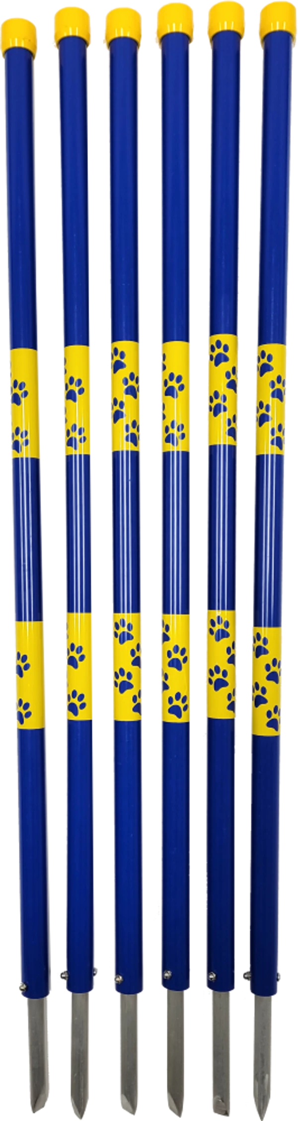 One word describes these weaver poles, and that word is “Substantial”. Most in-ground weaver poles are not that great but the Activedogs.com Agility In-Ground Weaver Poles are the exception. They are very sturdy and well built. These poles are attractively done. They are wrapped in yellow paw print wraps; the vinyl wraps are placed at 10” and 20” above ground. So, there is no taping to be done on the poles when you receive them. The top pvc caps are yellow, the wraps are yellow, the poles are royal blue. The in-ground posts are 5/8” thick and made from no rust aluminum. The posts are bolted all the way through the poles.