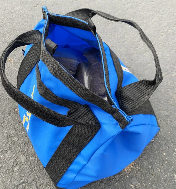 The base of the bag is covered in PVC Resin No-Slip materials. The No-Slip material bottom will help the sand bag not shift during use. The base is approximately 10” x 12”. This is a wide low-profile base and keeps the bags weight down on the ground. With this duffle style design the bag is not tippy and stays in place.