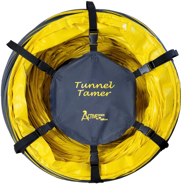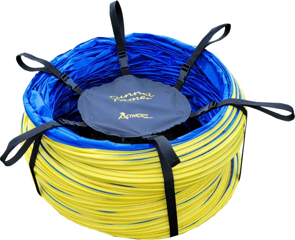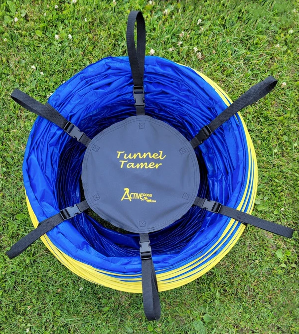 The Activedogs.com Agility Tunnel Tamer is just that. These large 4” pitch tunnels are heavy and unruly to put away and move around. The Activedogs.com 20’ tunnel weights over 60 pounds. The tunnel tamer is a life saver and is so easy to use. It is constructed of six heavy duty poly straps. Poly is a better material for outdoor use as it will not rot as fast as nylon. Because each strap has a looped handle two people can carry that big tunnel. The tunnel tamer is very easy to put on and take off.