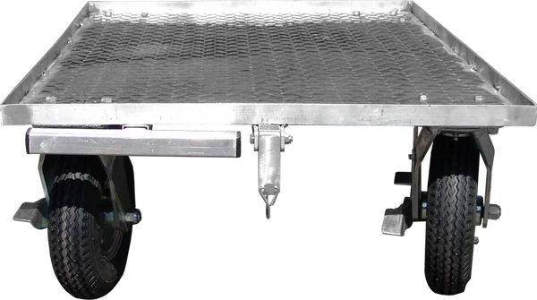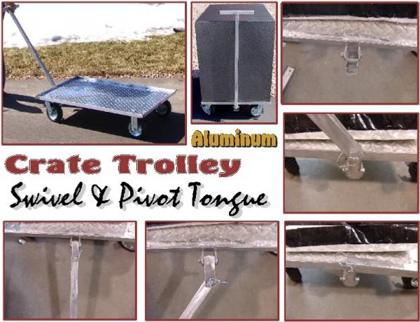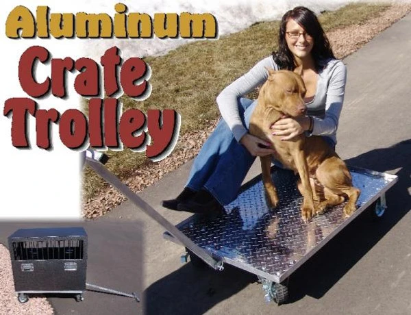 The Aluminum Crate Trolley floor is made from solid tread-brite aluminum, giving it a non-slip surface. The floor has a welded lip-edge to prevent crates from sliding off the cart. The trolley has a swivel & pivot tongue for easy maneuvering. The T-shaped handle is removable and retracts under the cart for storage. The trolley’s lightweight aluminum construction and pneumatic tires makes this cart easy to pull. The crate trolley has come in handy when we have had to move dogs in crates through the airport. We also use these crate trollies on our training field to move around field and agility equipment.