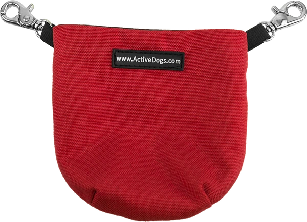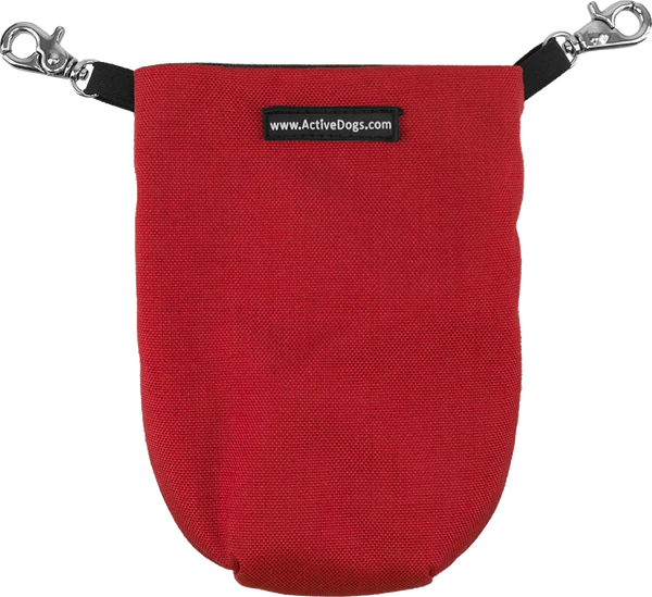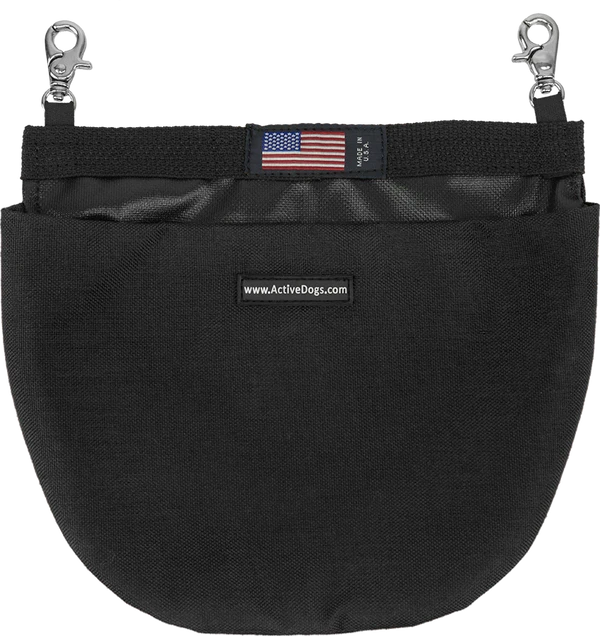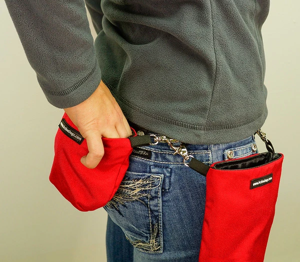 Belt Loop Bait Bags are very convenient as they snap on and off your pants belt loops. You can place them anywhere that works for you while training. Sometimes I train with the bag on my side and other times I want the treats to be hidden so I snap the bag to my pants back belt loops. You can wear multiple bait bags at the same time; one may hold the treats and the other a ball reward. They are double layer construction. The interior is made from a water resistant vinyl so it is very easy to wash out, making clean up a snap. The exterior is made of durable Cordura. The two swivel snaps are attached with elastic webbing giving the bag room to adjust while attaching to your belt loop. The large bag has hook & loop inside the top edge so the bag can be closed if desired. These Belt Loop Bait Bags come in three sizes. Size Large 10” x 9”, Small 8” x 6”, and the Mini Bag is 5.5” x 5.5”. I personally use all of them for different type of reward training, I most commonly tend to grab the size small because it is deep and when not using it as a food reward bag I store my phone in it. There are two colors to choose from red or black. MADE IN USA. Purchase separately or in a set of all three bags for a discounted price.