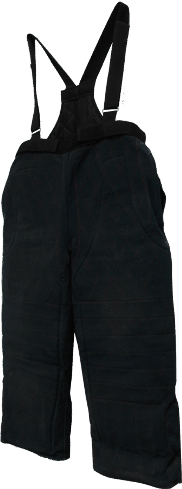 This product number is for medium/heavy weight bite suit pants. They are a bib with susperder style pants. Because of the back yoke the shoulder straps stay put and will not easily slip off the shoulder. They will give you good protection and flexibility without being the uniroyal man. These bite suit pants are easy to get off and on. The pants have open-close waist sides and open-close leg bottoms for easy access. The waist of the pants is adjustable on each side of the pants waist. They are constructed of French Linen (bite suit material). This long wearing type of material heals with puncture bites. The color is a gray/blackish color. You will not find another suit of this quality construction for this price. Made in the USA.