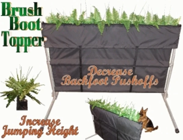 The Brush Boot Topper was designed to be used in practice not trial. By adding this Brush Boot Topper to the hurdle in practice, the dog will not have a solid foot hold to step down onto. Another benefit to the topper is that it will cause the dog to jump a little higher to clear the brush.