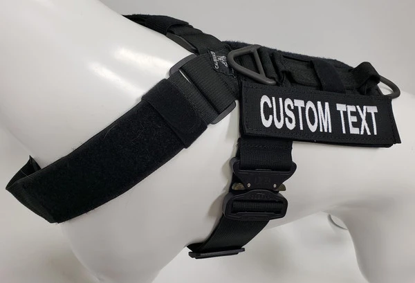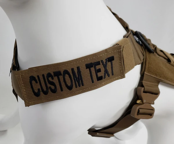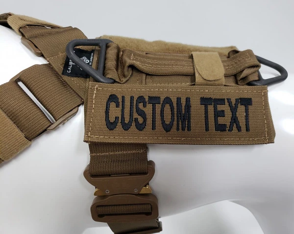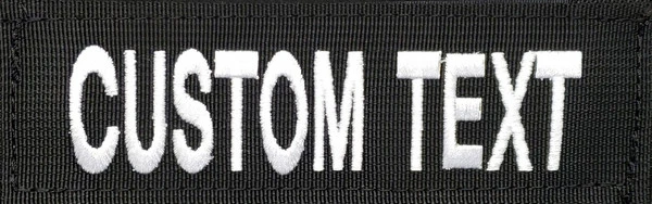 Design your own custom 2×6″ ID patch with up to 15 characters. Made from military-spec webbing with look & loop sewn on. Letting is done with high-quality embroidery. Embroidered here at Activedogs.com on commercial Tajima machines. Choose from black patch or coyote brown patch. Text on coyote brown is black thread and text on black is white thread. Uses hook & loop to attach securely to items, such as vests, collars, bags, ect.