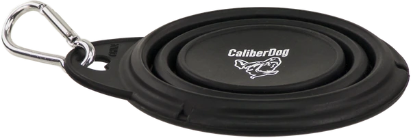 The CaliberDog Bait Bag includes the CaliberDog Tag Along Collapsible Dog Bowl. This dog bowl holds 8oz of water, but is only 1/2″ thick when fully collapsed.