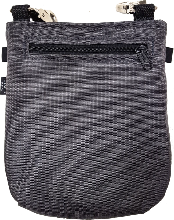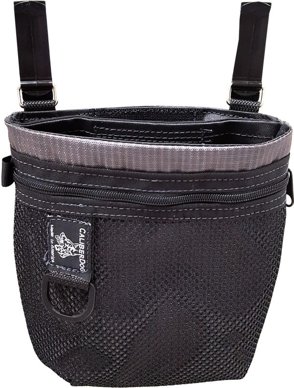 The CaliberDog Bait Bag is the best of all bait bag designs because of its many features. It is built with CaliberDog materials so it is built to last. It has several features: The front of the bag has a mesh pocket so your cell phone can be easily seen and heard when it rings. Because the mesh pocket zips you don’t have to worry about losing your phone when running. If you use head phones then the headphone cord can slip out the top of the zipper, leaving the phone secured in the pocket. There is a black D-ring on the bag front for clipping poop bags, keys, etc. There are two interior pockets. The second interior pocket has a hook & loop top closure. The front contoured pocket is vinyl lined with water resistant materials so it is very easy to clean out. The back outside of the CaliberDog Bait Bag has a small zipper pocket perfect sized for cash and cards. The exterior of this bag is made from the CaliberDog ripstop gray materials. This bag has double wall construction.