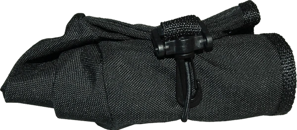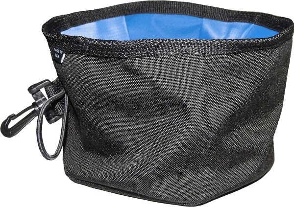 Large capacity foldable dog bowl for water or food. Like everything made in the CaliberDog series, it is the finest of goods and materials. Comes in black color with blue interior. This foldable water/food bowl is a large capacity bowl holding 64oz of fluid. It comes with bungee wrap so you can fold and roll up the bowl for storage. It has an attached no rust black plastic swivel snap so you can attach it for travel or you can hang the bowl for drying.