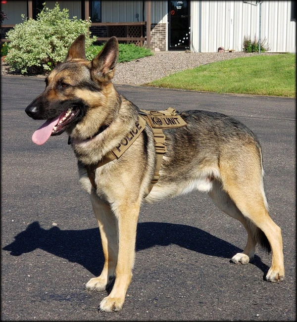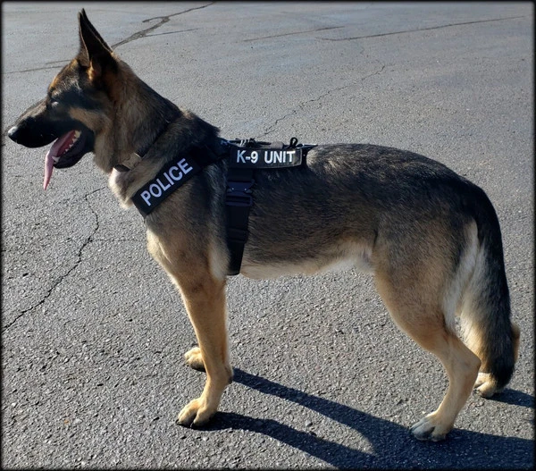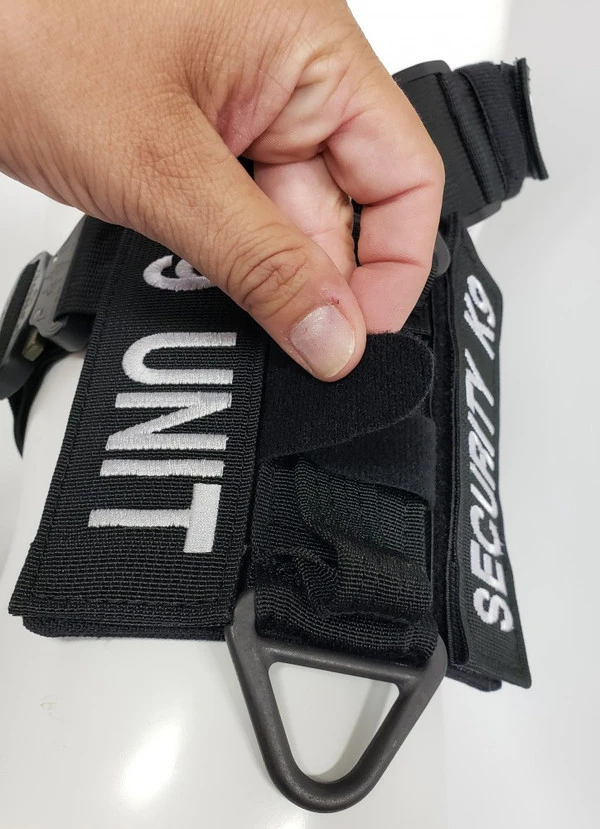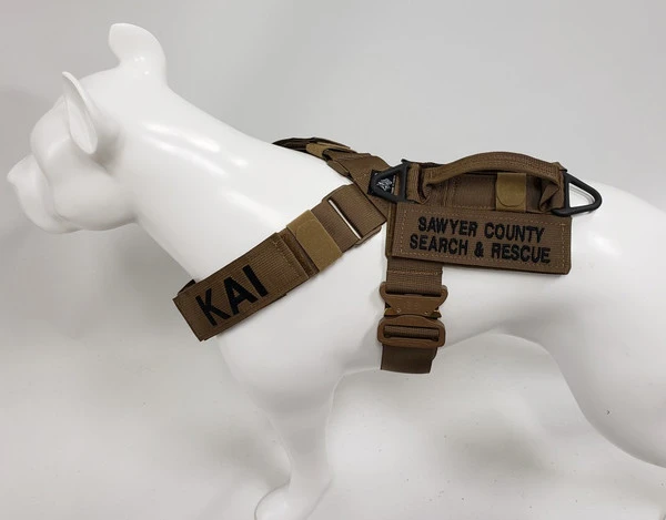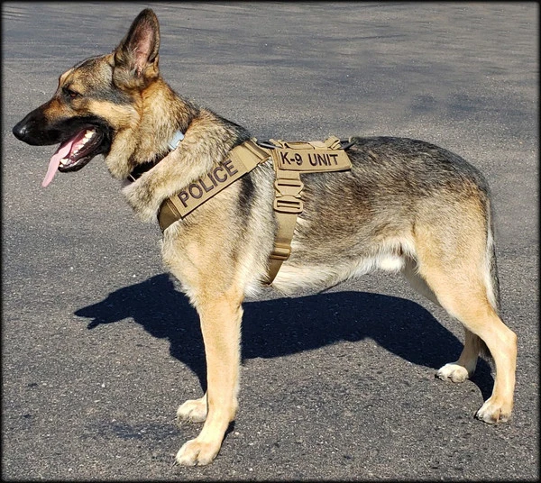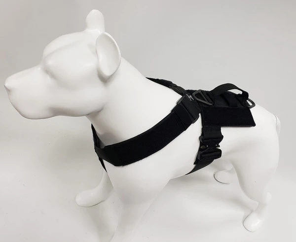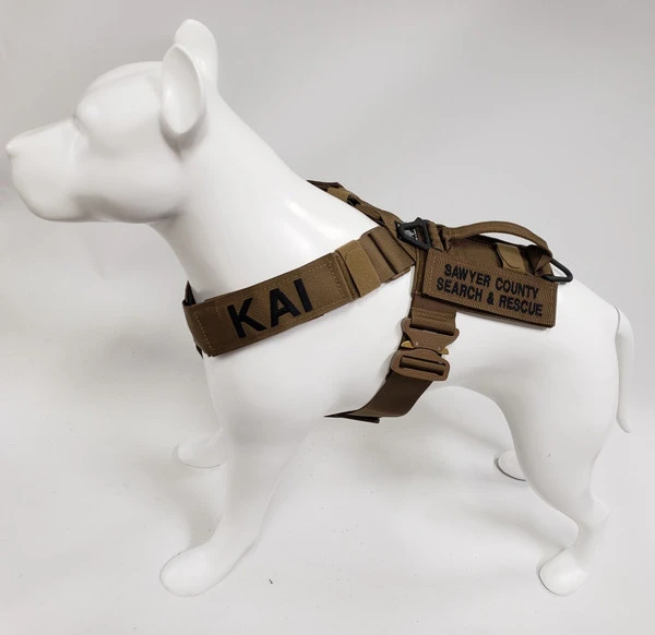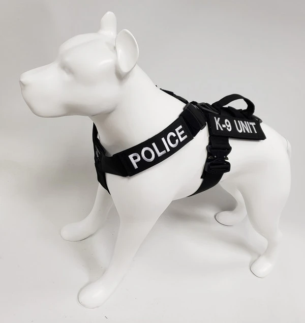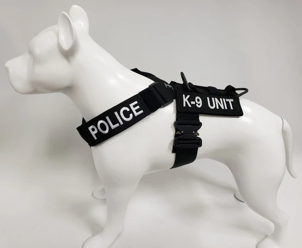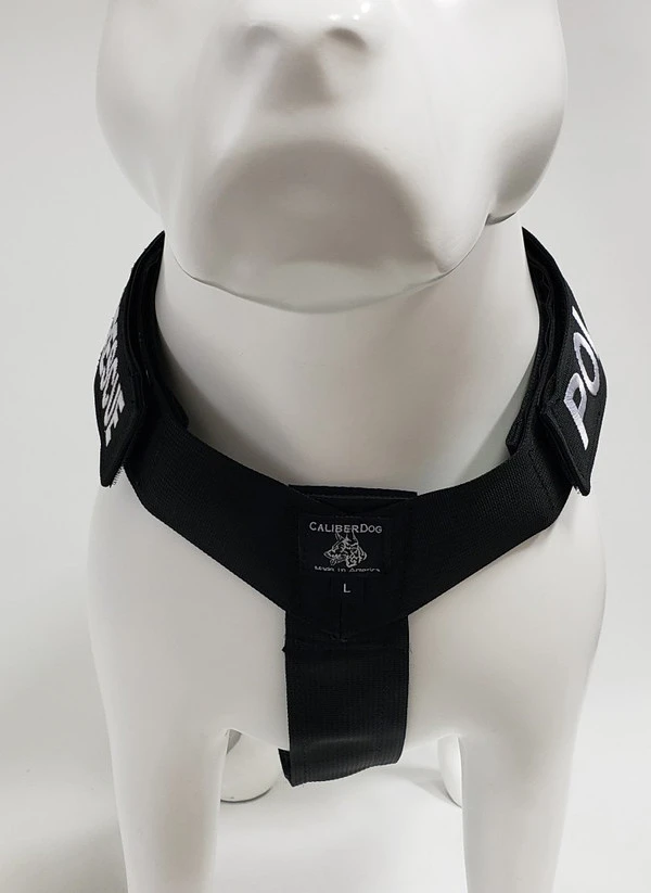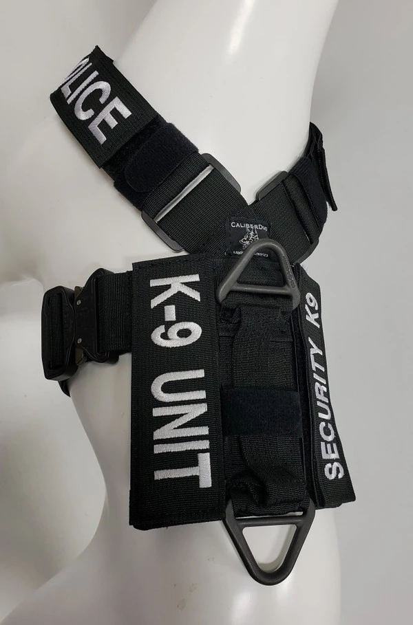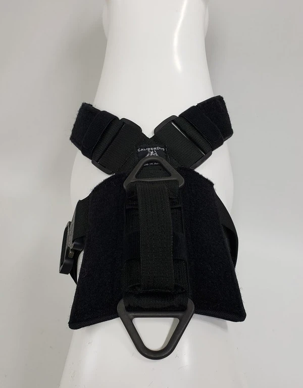 We have designed the CaliberDog K9 Tactical Harness with thought for those active working canines. This harness is made from strong military grade materials and yet light weight at the same time. There is a lot of flexibility for the dog when this harness is being worn. The CaliberDog K9 Tactical Harness makes the canine highly identifiable with places for 4 identification patch locations. (patches sold separately). Patches can be placed on the harness shoulder straps and or on the backplate of the harness. This harness has a handle that can be used standing up or flattened and hooked down on the harness. This is a nice feature to have the handle lay flat when the dog is doing search work. There is a 2” COBRA TM metal buckle on the girth strap. The buckle will not rub on the dog as it will be closed on the girth strap. All the straps of this harness, underbelly, shoulder and girth straps are all adjustable. The shoulder straps have an extra one-wrap loop to keep them secure. There are 2 cast metal V-rings on this harness. The front V-ring works well for use with the dogs leash and the back V-ring works well for tracking/trailing. They will not flop under the harness on the dog’s skin as they are attached on top of the harness backplate. You won’t worry about the backplate falling off as it is attached to the harness. The backplate gives the working canine a little padding on the dog’s backbone and Velcro space for additional patches. The CaliberDog K9 Tactical Harness is offered in two colors, black or coyote. Two girth sizes available: size M/L will fit 21” to 32” and size XL will fit 28” to 44” girth. Plain