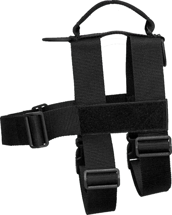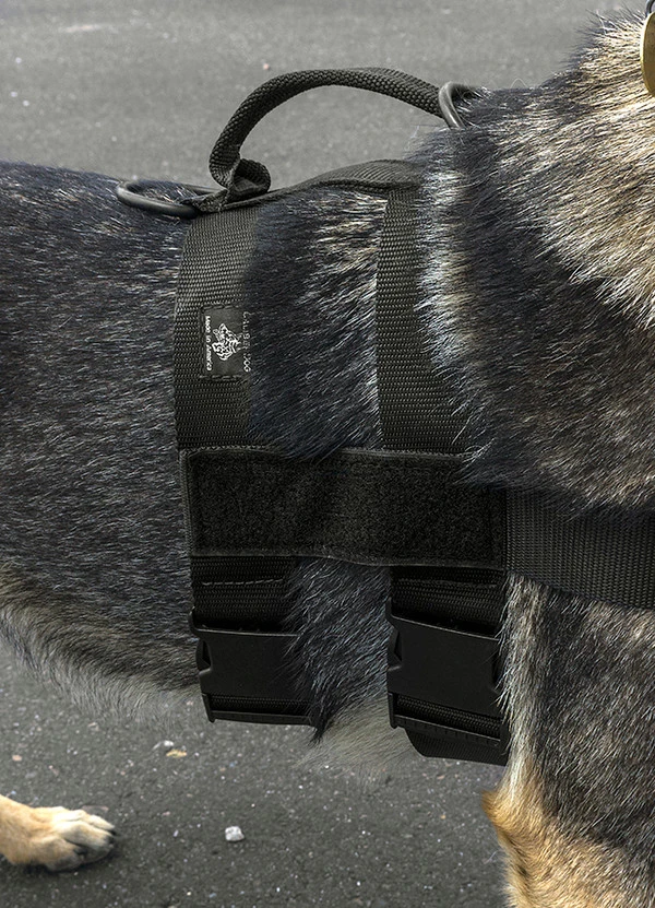 The CaliberDog Patrol Double Girth Harness is a heavy duty nylon webbed patrol harness that has two girth straps. Both girth straps are adjustable with slides so there are no floppy strap ends and close with side release buckles. The chest strap of this harness is also adjustable so the harness can sit back behind the dogs front legs where it will be comfortably worn on the dog. Each side of this patrol harness has 6” of hook and loop so ID panels and patches can be worn for identification. The top back of the harness has two large metal D-rings; these D-rings are large enough that the handler can fit their fingers into to lift the dog in harness. Also on the top of this harness is a webbed handle. The entire harness is blacked out with black webbing and black hardware. USA MADE