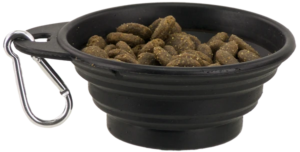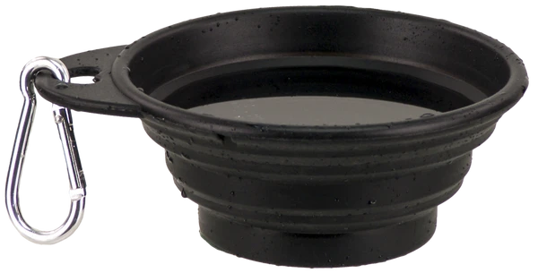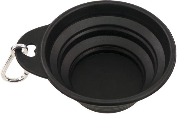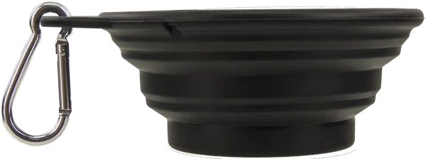 Make sure your dog always have easy access to food or water while they’re traveling with you. This collapsible pet bowl holds 8 oz of water, but is only 1/2″ thick when fully collapsed. This bowl is made of flexible black silicone so it will dry quickly and can fit comfortably in most pockets. Approximately 4 and 3/8″ diameter with a 3/4″ tab, where the included metal carabiner clips on. Diameter of base is 2.5″ and expanded height is 1 7/8″.