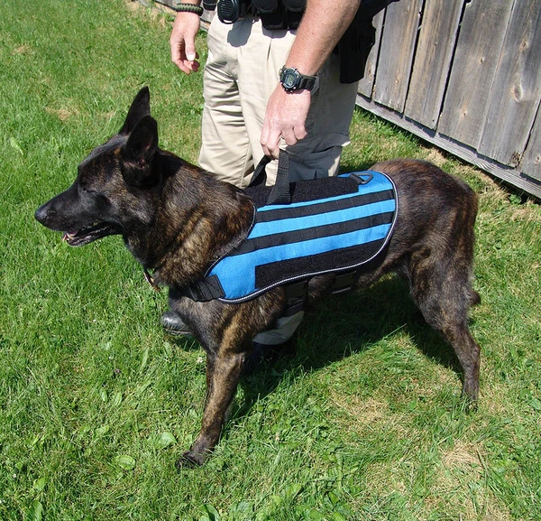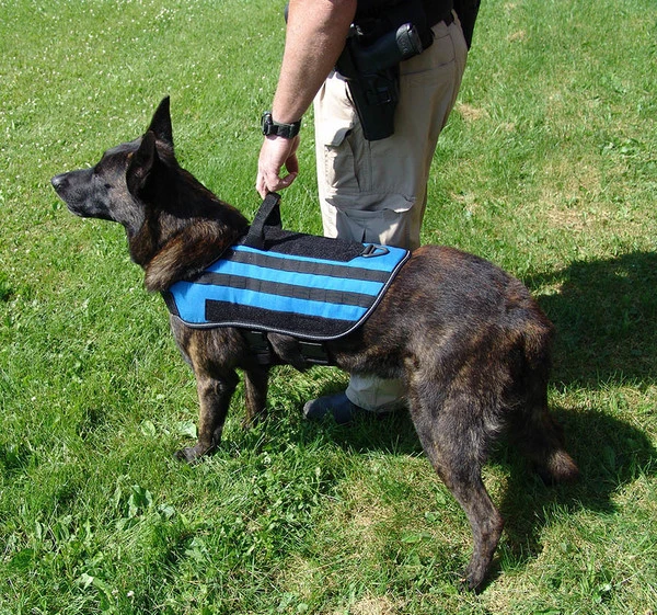 There is a row of 2″ hook and loop, and 2 rows of 1″ MOLLE straps on each side of the vest so accessories can be used with it. ID panels or patches can be attached to the top hook and loop or the side hook and loop of this vest. The vest has double girth straps and a chest strap so it will fit securely on the dog. The adjustable chest/neck strap sits above the dog’s breast bone eliminating any gap at the neck area of the vest. The lay-flat handle can be stuck down to the hook and loop when it’s not needed.
