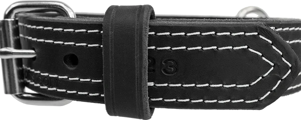 This is a high quality very stable leather collar. It is craftsman hand stitched with precision machinery. It will last you a lifetime and is a perfect size for many types of working dogs. Latigo leather is a durable, flexible, softer leather and it breaks in faster. It is dyed solid all the way through, so it will not fade. Because of the conditioners that are infused with oils during the process latigo leather is almost waterproof. It will not dry out like most harness leathers.