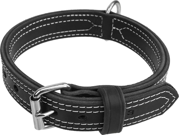 The activedogs.com wide 1.5″ Leather Collar is made with two layers of durable solid dyed latigo leather. These two layers of leather are double stitched together. The placement of the D-ring allows the collar to be in proper position for attaching your lead. Quality, chrome welded hardware is used on this collar.
