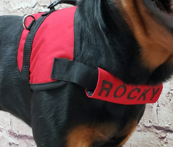 Our Chest Strap Identification Covers are a great way to show a custom message with your working dog. Choose your own text, up to 20 characters. Choose from 2 different lengths & 13 different colors! The Custom Chest Strap Identification Covers are padded and lined to give your dog comfort. Covers open and close with hook & loop so they are very easy to put on and take off. These strap covers fit a wide variety of vests. MADE IN THE USA