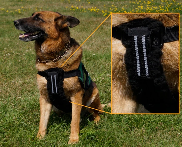 Chest to Girth Support Strap is a support strap that can be added to our vests or harnesses. It is easy to put on and take off with the hook & loop type closure. The front part of the Chest to Girth Support Strap covers the dog’s breast bone and has safety reflective materials on the front of it. This support strap works especially well with vests that have packs on them because it keep the vest and packs in the upright position. This Chest to Girth Support Strap goes down the chest through the front legs under the belly of the dog and attaches around the girth strap of your vest or harness. This support strap will help support the dog’s underbelly making the vest/harness a more secure harness for pulling or carrying packs while the dog is working. This Chest to Girth Support Strap also works well for those dogs that want to roll and rub off their vest/harness. You can choose this Chest to Girth Support Strap made from Neoprene or Sherpa. Made in USA