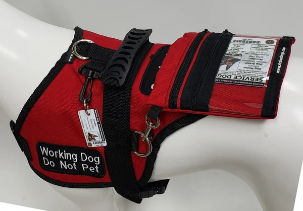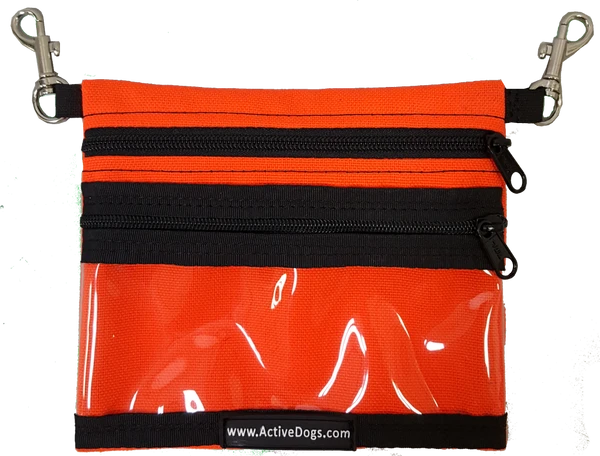 Our newly redesigned Clip-On Service Dog ID Pocket Bag is made with 1000 denier coated fabric to make it durable and easy to clean. One side of the bag has a zippered pocket with a clear vinyl window for identification cards or medical paperwork. The other side is embroidered with large text: Service Dog and a medical cross. At the top, there is a zipper with a pull tab and 2 snaps for attaching the Pocket Bag to your dog’s vest, your clothing, or gear bag.