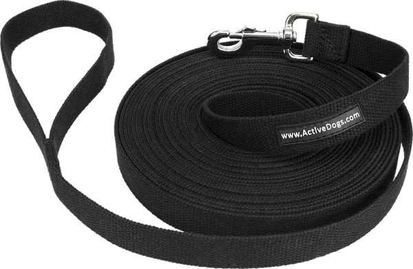 This Tracking Line is made of heavyweight cotton web. Cottom tracking lines are hard to come by but we still use them as our preference. I have always used a cotton tracking line because it does not get slimy when wet and dries fast. The activedogs.com cotton tracking line is regulation length (33 feet/10 meters) for IPO Schutzhund work. It has a swivel bolt snap at one end and a looped handle on the other end. Both ends are box stitched for added durability.