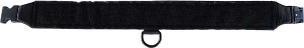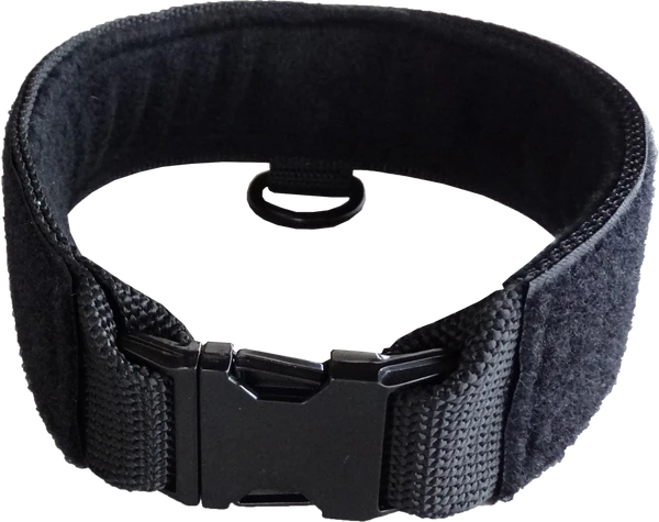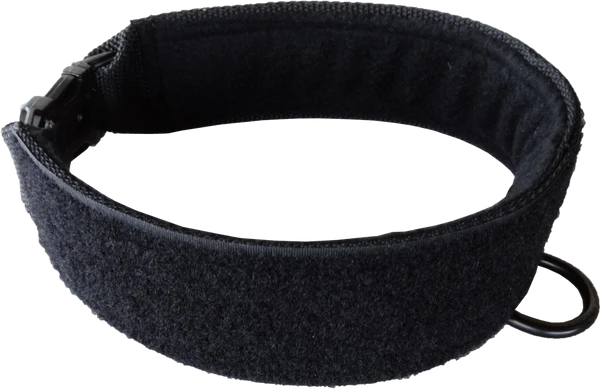 This dog collar has all metal hardware. The black, contoured side release metal buckle is sized smaller than the 2” collar. There is a welded, black metal D-ring attached to the top of the collar for easy leash attachment.