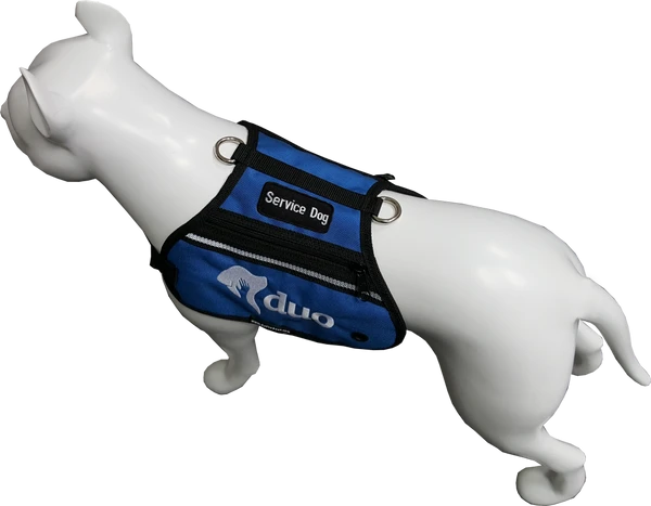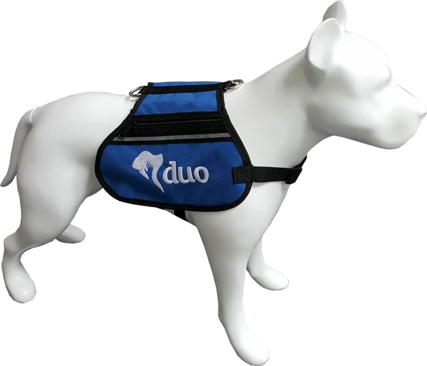 The Custom Logo Butterfly Dual Pocket Dog Vest has two, heavy duty D-rings on the top that are stitched completely through the vest, so you can use a Neoprene Handle (product #7075546) with the vest. The D-rings can also be used for attaching a leash or ID tags.