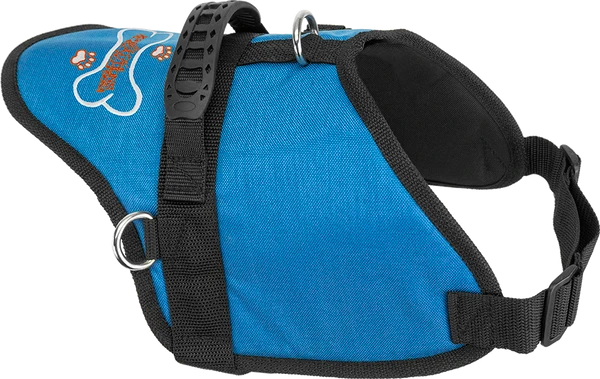 The vest fits over the dog’s head and attaches with a wide, quick release buckle on the adjustable girth strap. The front chest strap has two slides for two-way adjustment to better fit your dog.