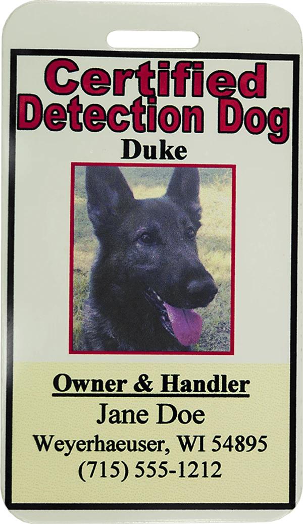 The Detection Dog ID is made from aluminum. It is coated on both sides and then the ID information is baked into the finish using a sublimation process, this gives it a strong bonded finish. There is the ability to have custom wording along the sides of the picture, words running vertical.