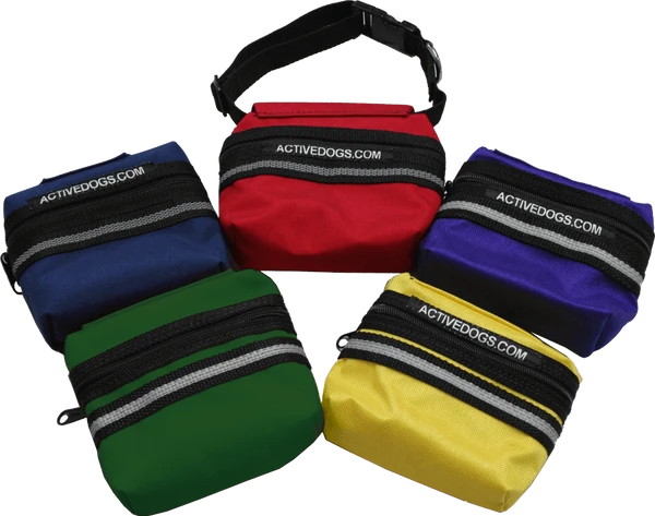 A collar, made of 1” heavy nylon web, with a heavy welded D ring and a plastic side-release buckle and adjustment slide, comes with the pouch. The bag can be removed from the collar and attached to your belt. Comes in 13 color choices, three collar choices. Made in the USA