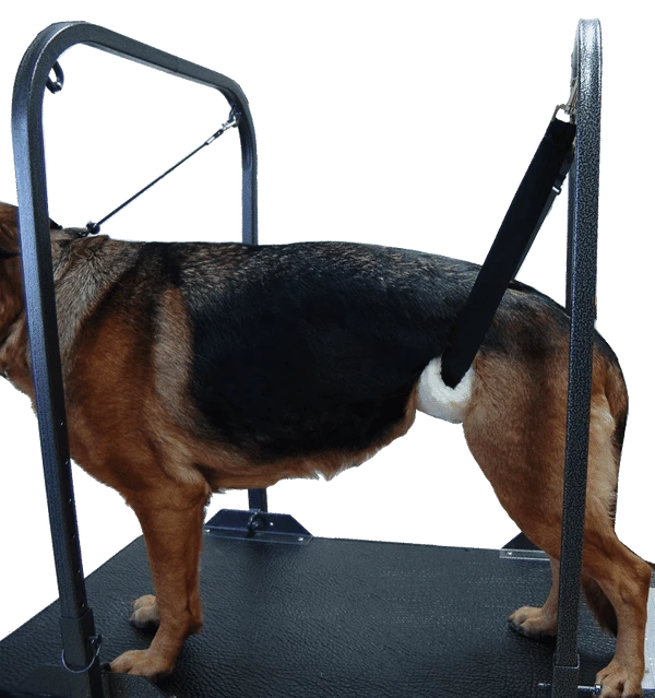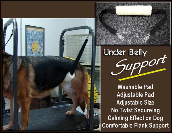 Wonderful tool to aid in grooming dogs that don’t stand well on the grooming table. It is not uncommon for older dogs to have a hard time to stay standing for the entire groom. And puppies like to squirm around on the table while grooming so we have solved this problem by developing our Under Belly Support. The great thing about this support is that it is not in the way when the dog is loading onto the table. The dog does not need to step over it and you do not need to clamp it down on the table to use it. The Under Belly Support has an adjustable length to accommodate any size dog. Very simple to use, after the dog is on the table then you just slip it under the dogs belly and attach one snap end to your groom arm then adjust it to the length desired and then attach the other snap to the groom arm. Now the dog is in position and no twisting and turning around so your groom will go faster and be safer. The Under Belly Support comes with a thick Sherpa comfortable pad for the dogs under belly flank area to rest on. The Sherpa pad is Hook and Loop closing so it can easily be removed for washing. It is machine washable which is sanitary and convenient. The Under Belly Support will work with a single grooming arm or our Double Grooming Arm Safety Stand. Made in the USA