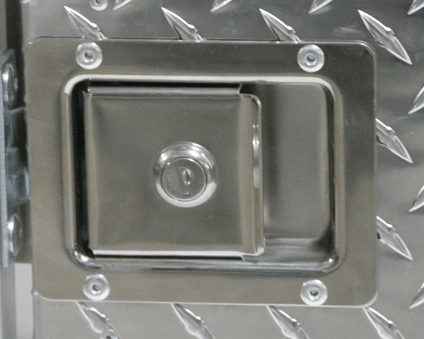 The full ventilation design permits excellent air movement on all sides. This is a great feature for dogs that remain in the dog crate for long periods of time. The double door crates feature a door on the end and a door on the side. This full ventilation dog crate comes in 3 different sizes. The smallest crate measures 36″ long, 28″ tall, and 24″ wide. Most inside wheel-well measurements in trucks, vans, and SUVs are 48″ wide. This way you can fit any two of the small crates we offer in your vehicle side-by-side. The medium crate measures 42″ long, 32″ tall, and 28″ wide. The largest crate measures 48″ long, 32″ tall, and 28″ wide. The gap between the bars on the crate is 2″. The top and bottom of the dog crate and the doors are polished, thick diamond plate aluminum. Each door is laser cut, double reinforced, and features a stainless steel, locking door latch with one key. The doors can be latched with or without locking it. class=”text” align=”left”>Each side panel of the dog crate has two recessed handles. The handles are spring loaded and stay flush with the side of the dog crate when not in use. These handles make carrying the crate safe because you do not have to put your hands in through the bars to move the crate. class=”text” align=”left”>There is a welded bar inside the dog crate side wall to hang a flat sided pail (sold separately). This prevents the dog from tipping over it’s water so easily, therefore having a dry kennel to lie in while traveling or at training. You can also hang a crate fan on the outside of the crate.