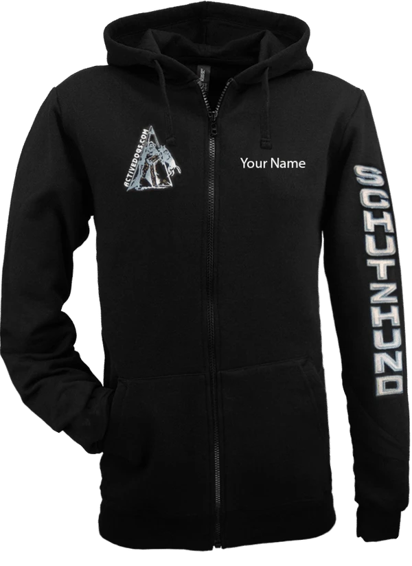 The Embroidered Schutzhund Hoodie is a heavyweight (7.8oz.) 50/50 cotton/polyester blend that is pre shrunk. This hoodie is made for warmth with out being bulky, It is a zip-up style hooded sweatshirt. The four sizes (M-L-XL-2XL) come in black, blue, red, or gray. Black draw string, hoodie lining, and zipper on all colors.