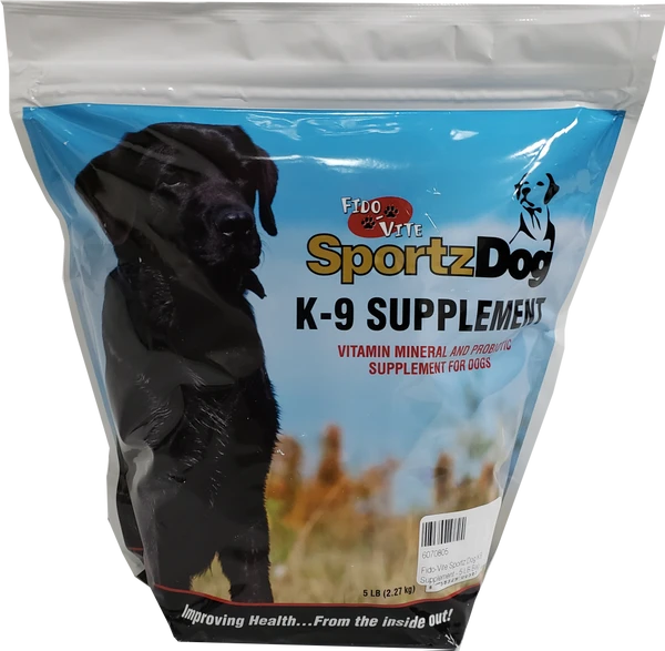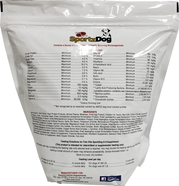 Fido-Vite Sportz Dog is a complete canine supplement formulated to complement your regular dog food. Fido-Vite Sportz Dog comes in a palatable meal form that contains beneficial probiotics, digestive enzymes, highly available trace minerals and phytonutrients that improve intestinal health, enhance nutrient utilization and provide key nutrients important to hard working sport dogs during high physical demand or gestational and lactation reproduction requirements.