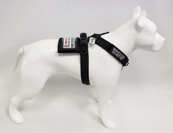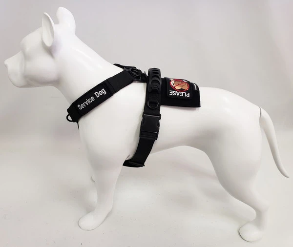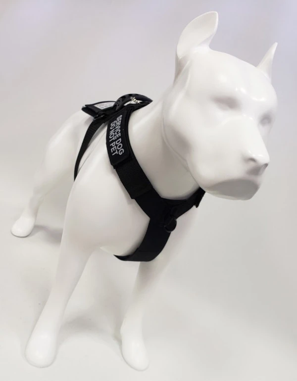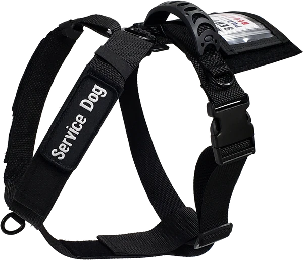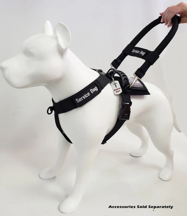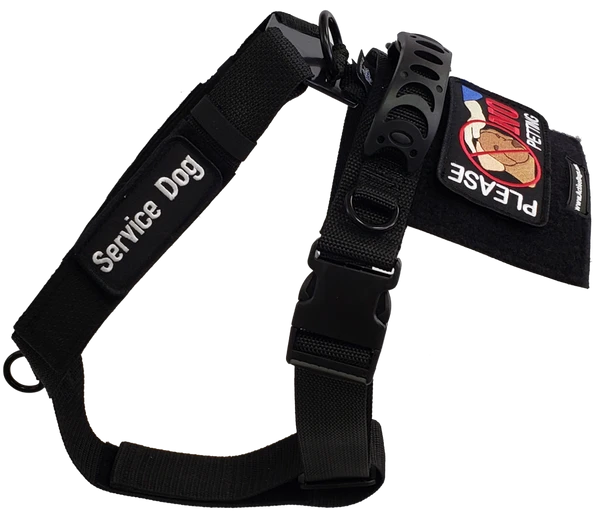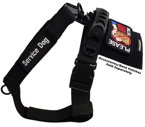 The No-Pull Service Dog Strap Harness has a great range of adjust-ability. Both the chest straps, underbelly strap, and the girth strap is adjustable. There are no loose floppy straps on the No-Pull Service Dog Strap Harness. It comes with two Service Dog patches that are Velcro backed so they can be changed out. The entire back plate is also Velcro so patches or an ID pocket window accessory can be added, (sold separately). The handle is a raised molded easy grip handle with two D-rings. The D-rings on the sides of the handle can work to attach an extended bridge handle, (sold separately). This harness is black in color and is offered in two sizes. Girth size for M/L harness is 22” to 32” and the size XL harness will fit a girth from 29” to 44”. Bridge handles, custom patches, ID window pocket, and ID cards are sold separately.