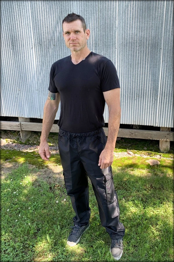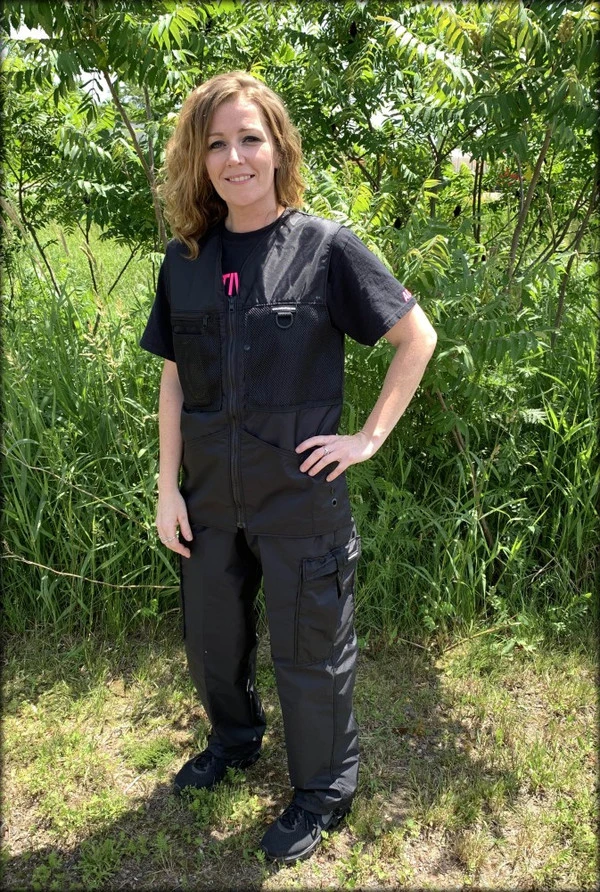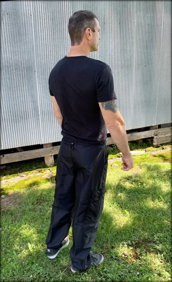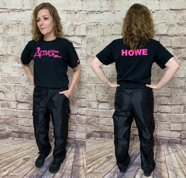 The ActiveDogs handler training pants are cargo style pants with added features. The Handler Training Pants are made of soft durable wind and water-resistant nylon fabric. All the pants seams are double stitched seams for long wearing durability. The elastic self-adjusting waist band makes the pants easy to put on. The waistband is comfortable and has the added feature of a tie able draw cord. The leg bottoms have an elasticized cord lock so the bottom of the legs can be tightened around your ankle and bloused. This is such a great feature making it fast and easy to get your pant leg into your boots when tracking in that wet morning grass. The trouser pockets in front are reinforced deep pockets and the right-side pocket has with a special little inside pocket for cards. On the side of pant legs, there are large expanding cargo pockets. Features of the cargo pockets are hook and loop closing top flaps with easy grab plastic triangles. These open triangles can also be used to attach a pull tab. The right cargo pocket has a side zipper. This works well to put your phone in as it will not fall out when running. The left cargo pocket has an open top back pocket. This is where you can put your tracking or training remote for quick access. In the center of the back of the pants there is a D-ring. This is an excellent feature to hang the ball or tug away from the dog during training. The Activedogs Handler Training Pants come in five sizes. MADE In The USA