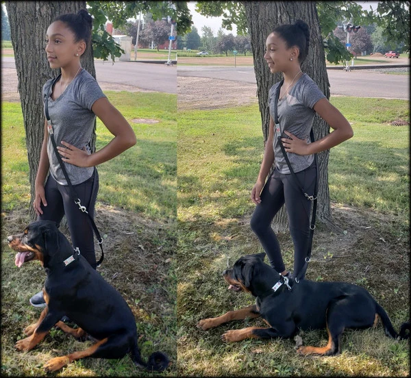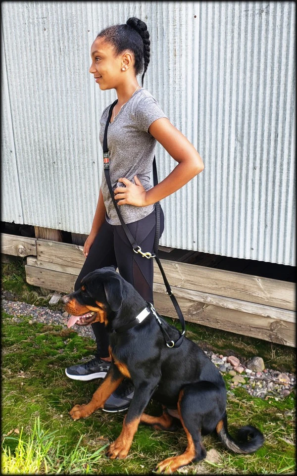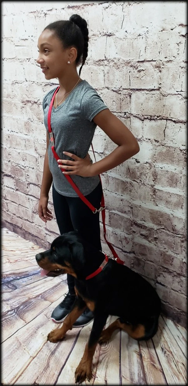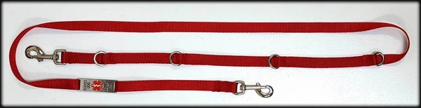 The purpose of this Service Dog Hands Free Chrome Tag Leash is to have the dog work with you and adapt to your body movements. It is made of ¾” wide nylon and has an attached high quality engraved Chrome identification tag. This is a well-made leash with sturdy all metal hardware. The chrome tag identifies a working service dog. The top of the tag has engraved text that says “Service Dog”, and on the lower part of the tag the text reads “Do Not Pet”. When using a hands free leash the dog learns to be attached to you and anticipate what you are doing and the direction it should move with you. I have used and trained with this style leash for many years and have found it to be the fastest way to teach a dog to stay with what I am doing and work with me. This is the leash I always use to take a dog out in public. It is so functional and versatile I would not be without it. One of the benefits of this leash is that it gives you free movement of both your hands. You can work attached to the dog and at the same time move independently from the dog. It is much easier to push a shopping cart, open doors, or pick up objects when you have both hands free. When you are using this lead you will direct the dog with your legs and body movements as much as touching the leash. The lead rests across your shoulder and wraps under your arm and stays close to you so you have quick access to the leash. It is adjustable with different rings that are set into the leash. This is so that the dog can be placed at different lengths away from the handler. And it gives the dog freedom to stop and lay down and rest when the lead is set on the closest snap ring. The length is 7’ long and comes in two color choices, red or black. Matching collars are also available. Made in the USA at activedogs.com