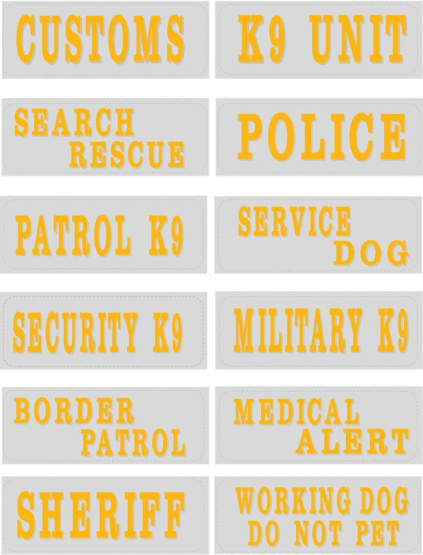 ID Panel with black or gold lettering. Highly reflective background. Uses hook/loop to attach securely to item such as Nylon Patrol Harness (763055) or Embroidered Patch Collar (407083).