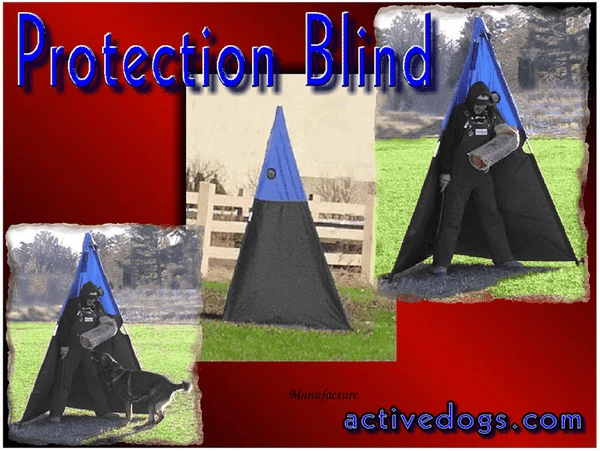 There is not another blind on the market that can come close in comparison to this product. This blind is handcrafted with every detail that makes it the best. It is made of marine grade materials for lasting outdoor use. We have had one of these blinds on our training field since 2002 and it is still in working condition. The Activedogs.com telescoping blind is done in beautiful two tone colors of blue and black. The pole system is telescoping anodized light weight aluminum poles. No more dirty pipe junk coming off on your hands and clothes. The poles are 8’ in length so even that tall helper can hide behind. The poles telescope down to 4’ in length for perfect storage. The top of the poles are held together with a locking pin system that easily snaps open for drop down storage. They are protected by a 4 layer reinforced hood. This blind will never slip down the poles as the reinforced hood holds them in place. There are two small peep windows that are web reinforced and double netted to keep the helper hidden when watching for that incoming dog. The blind has a spike hold down system. The spikes come with the blind. The bottom of the tent is web reinforced all along the edge. There are no nasty short spikes welded onto the poles to tear up the inside of your vehicle. The poles also have rubber end caps for working indoors during those winter months so it stands secure alone.
